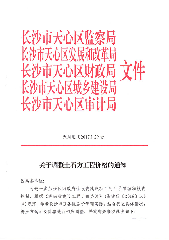 • 長(zhǎng)沙市天心區(qū)關(guān)于調(diào)整土石方工程價(jià)格的通知天財(cái)發(fā)[2017]29號(hào)文